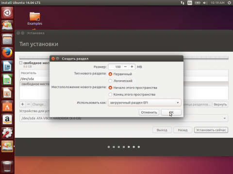 Если же мы, устанавливаем Ubuntu единственной системой, первым нужно создать, тот самый, раздел для UEFI.